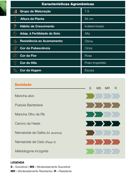 Potencial produtivo com resistência a nematoides. Principais características: Grupo de maturação 7.9, Ciclo – safrinha M4 e M5, Resistência a nematoide de cisto – R3, Arquitetura de plantas – entrenó curto, Número de vagens de 3 grãos, Boa tolerância ao acamamento, Sistema radicular agressivo.